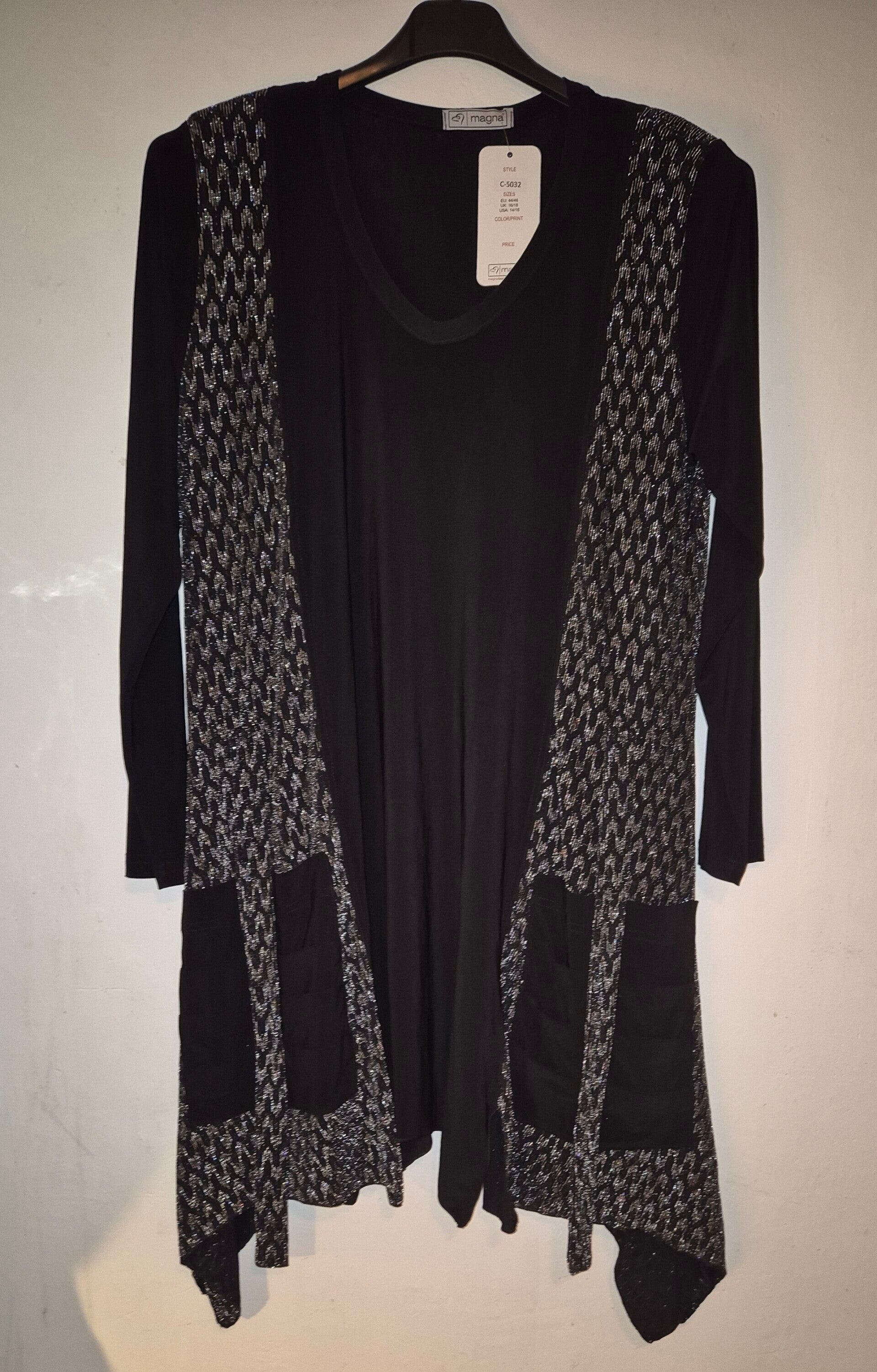 Tuniek zwart/zilver met 2 zilveren banden van boven naar beneden en aankondigingen de buitenkant een punt doorlopend